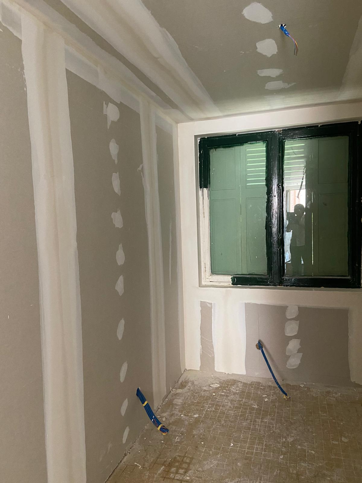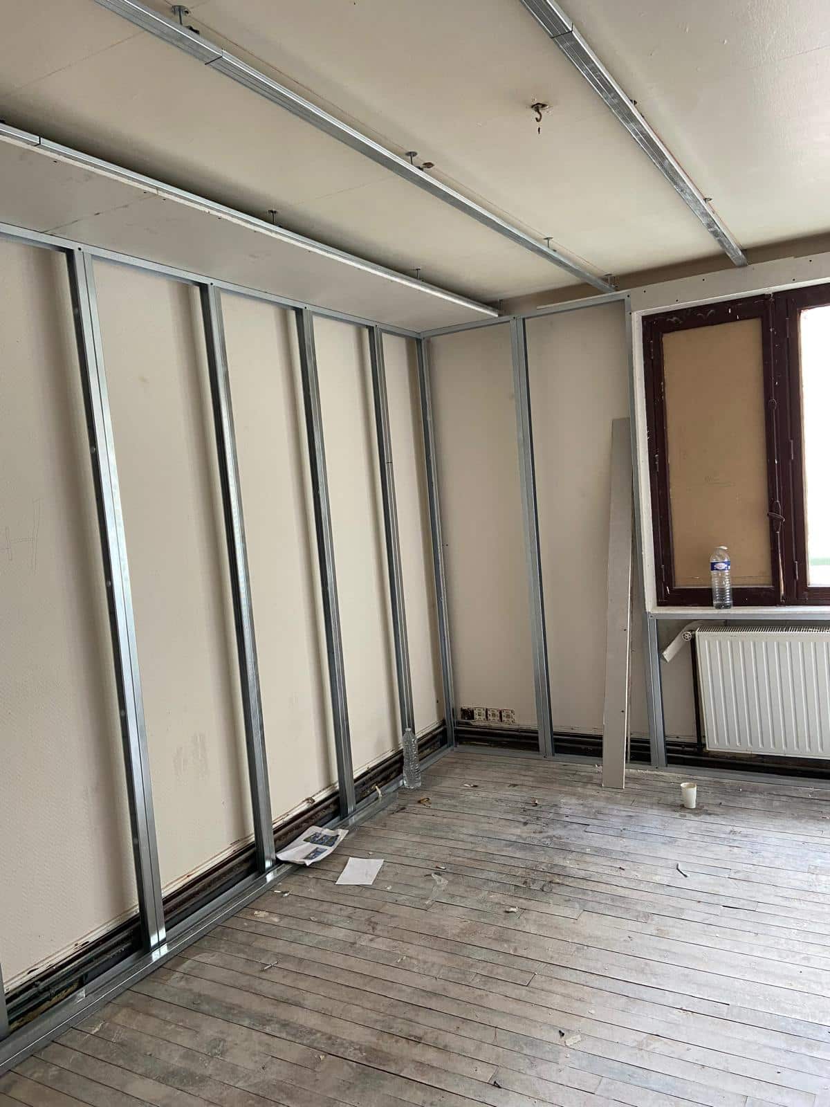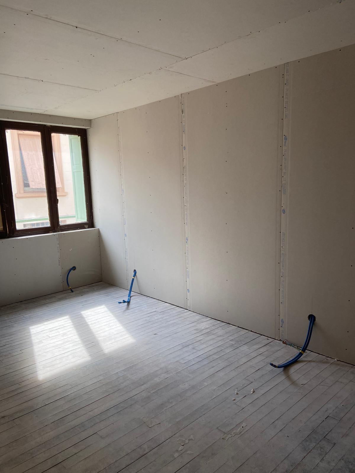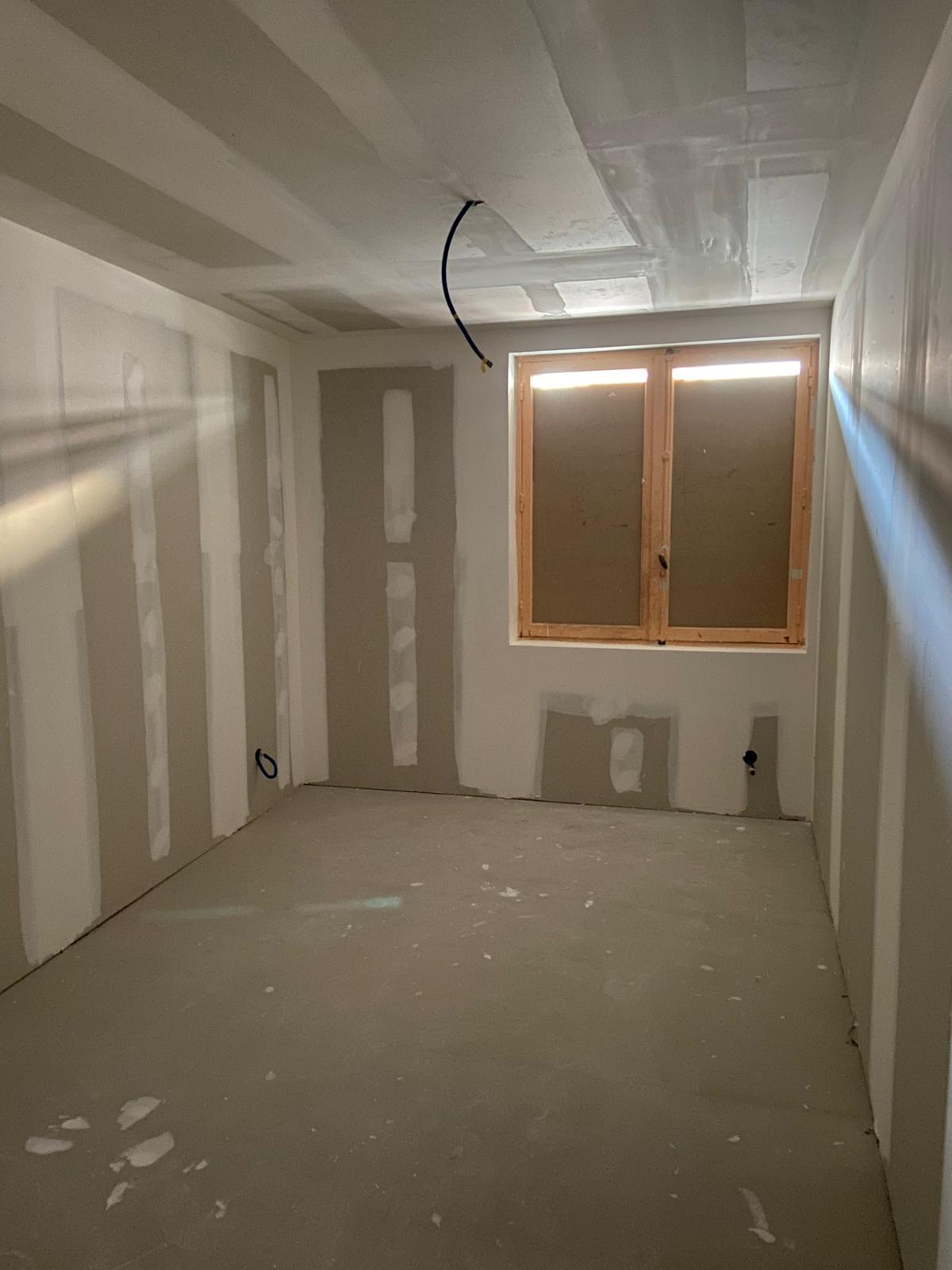 Notre équipe a procédé au doublage en placo de tous les murs ainsi que des plafonds, offrant une surface lisse et uniforme, prête à recevoir les finitions. En parallèle, nous avons installé une isolation par l’intérieur, optimisant ainsi les performances thermiques et acoustiques du bien. Cette solution permet de maintenir une température agréable en toute saison tout en réduisant les nuisances sonores extérieures.