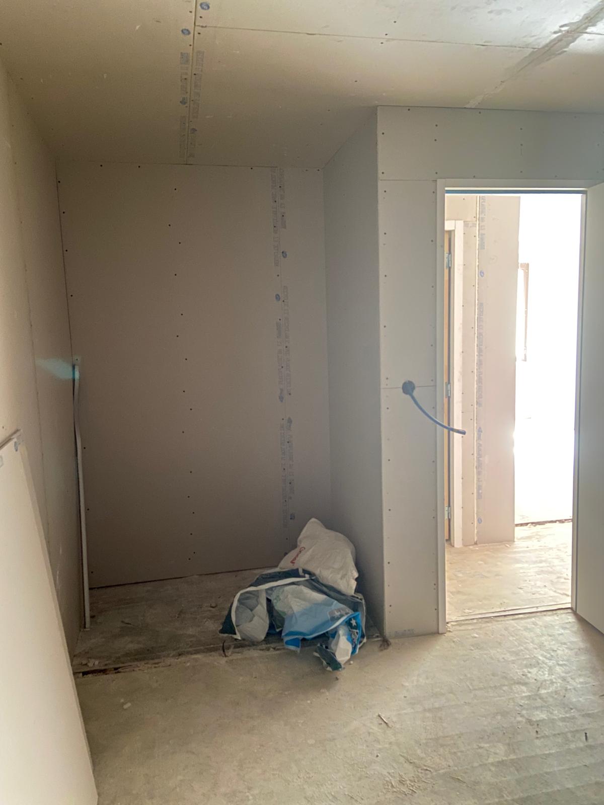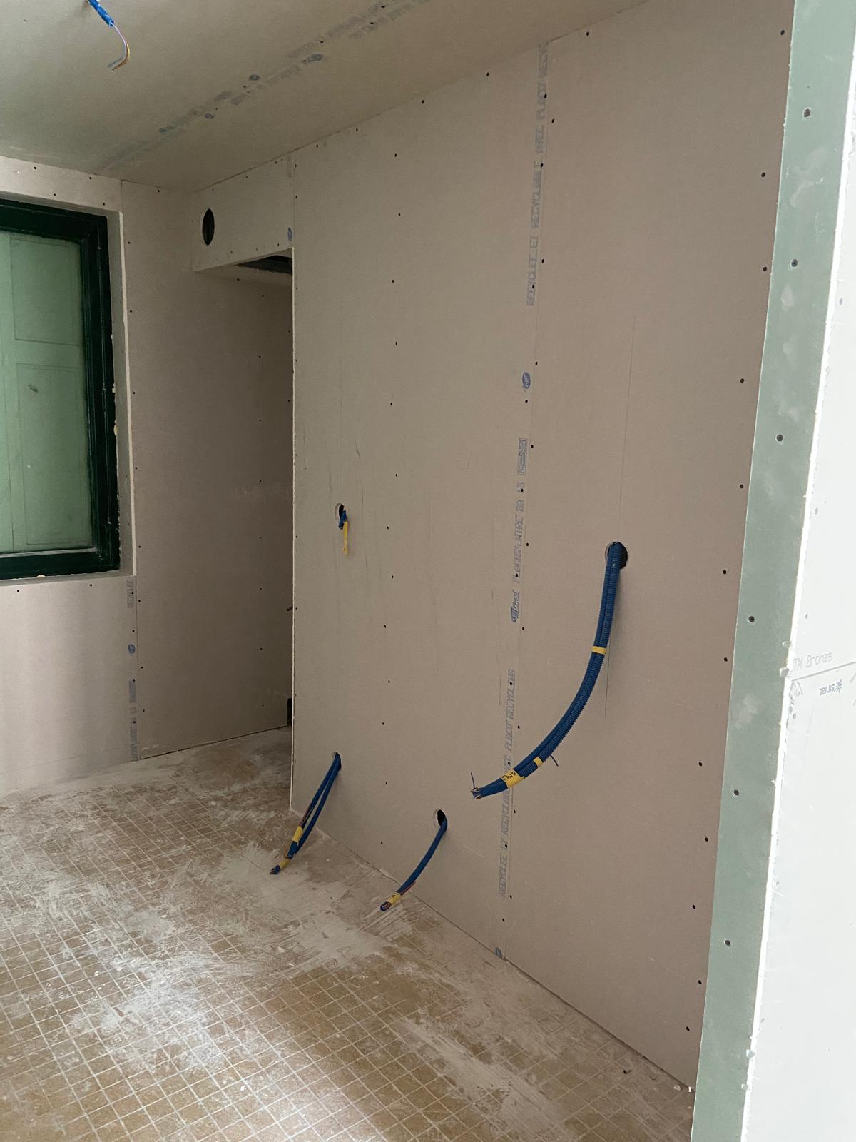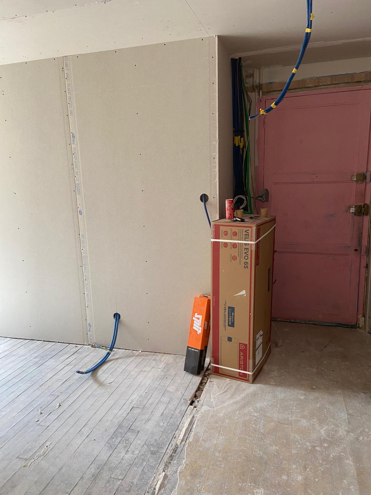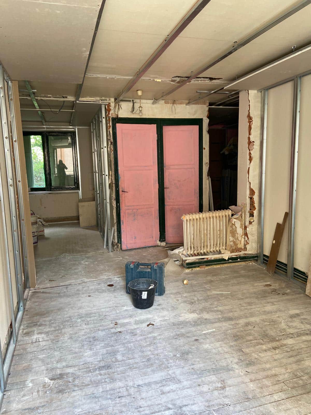Notre équipe a procédé au doublage en placo de tous les murs ainsi que des plafonds, offrant une surface lisse et uniforme, prête à recevoir les finitions. En parallèle, nous avons installé une isolation par l’intérieur, optimisant ainsi les performances thermiques et acoustiques du bien. Cette solution permet de maintenir une température agréable en toute saison tout en réduisant les nuisances sonores extérieures.